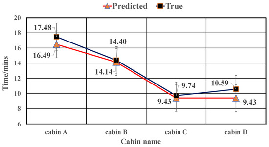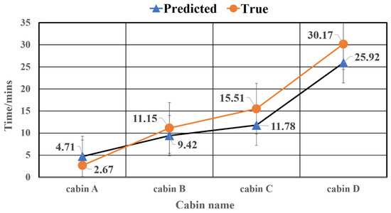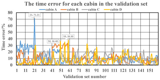 From Figure 9, it can be found that the error between the predicted and target time of compartment A is 2.04 min, and the errors of compartment B, compartment C, and compartment D are 1.73 min, 3.73 min and 4.15 min, respectively. The time accuracy rates are 28.79%, 85.49%, 76.96%, and 86.25%. Compared with the evacuation time of more than ten minutes, the error of the compartments of BCD is acceptable. Poor time prediction results for compartment A. However, the prediction error of compartment A belongs to the only example in the 160 sets of data. Moreover, this is the flooding scenario with the largest error in the entire validation dataset. The errors of other flooding scenarios are much smaller than this data, as shown in Figure 8.