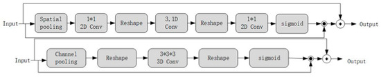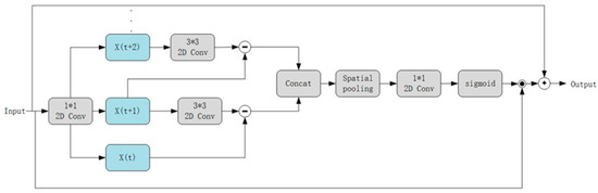 As shown in Figure 4, the structure of the spatial temporal excitation method is similar to that of the SE net [25]. By making a global average pool for all channels and introducing a single channel 3 × 3 × 3 3D convolution, it is possible to obtain a spatial temporal attention image with a very small amount of computation and increase the connection between successive video frames. The attention image is then dot multiplied by the input features to obtain the corresponding features excited by spatial temporal information.