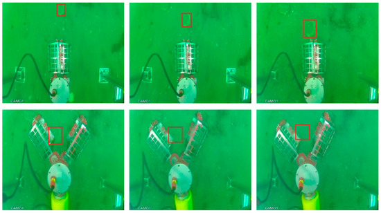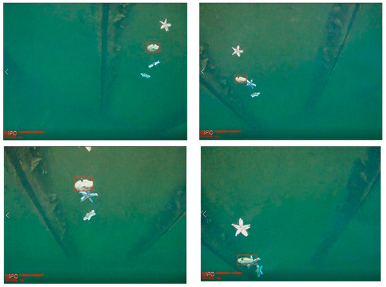 Firstly, the underwater dataset was used to validate the proposed algorithm. The advancement of the proposed algorithm can be seen qualitatively from the pictures presented in this paper. Figure 13, Figure 14, Figure 15 and Figure 16 show some underwater tracking effects. The red boxes in the figures represent the tracking box. The lower left corner shows the score, frame rate, and whether to track the target. Figure 13 shows the tracking effect when the target is a sea urchin. It can be seen that the tracking will not be disturbed by nontargets such as starfish and lobster in the field of view. Figure 14 and Figure 15 show the tracking effect when the target is a starfish. Compared with Figure 14, the background environment is more complex and has a good tracking effect at all positions of the field of view. Given the similar interference, scale change, target occlusion, and disappearance reproduction, the algorithm in this paper can still produce good tracking results. For example, the last picture in Figure 14 is the real-time tracking effect of the starfish target disappearing from the field of view and returning to the field of view. It can be seen that the tracking response is rapid, and the regression effect of the box is very good. As can be seen from the fourth picture in Figure 15, there is interference similar to the appearance of the target starfish, and part of the target starfish structure is obscured. This algorithm can clearly distinguish the tracking target without interference. It can be seen from the last two pictures in Figure 15 that when the starfish has a large shape change (such as the change from front to side caused by camera movement or angle change), the target can still be tracked and the size of the tracking frame can be adjusted with the shape change. Figure 16 shows the tracking effect of scallops at different positions and angles in the field of vision. Figure 17 shows the tracking results of sea cucumber targets, with relatively different backgrounds, reflecting the ability of the algorithm to deal with complex and diverse underwater environments. Figure 17 and Figure 18 show the tracking effect under the influence of currents in a real undersea environment. It can be seen that the underwater target can still be tracked when it is affected by the visual effect brought by the currents, which can support the subsequent operation tasks.