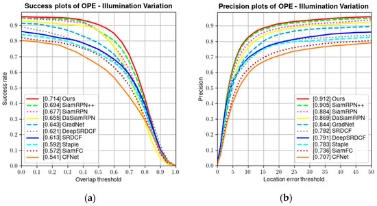 Comparison of algorithms under the interference of illumination variation; (a) success rate curves; (b) precision curves.