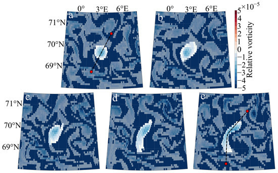Vortex evolution during the period of stretching: (a) 3 April 2012, (b) 9 April 2012, (c) 14 April 2012, (d) 19 April 2012, (e) 24 April 2012. The scale shows the relative vorticity values; the horizon is 541 m. The dashed lines and red circles in panels (a) and (e) are used later.