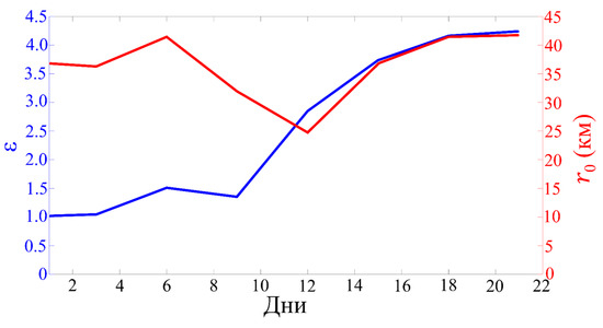 Dimensionless parameter of the vortex horizontal elongation ε (blue curve) and its effective radius (red curve). The x-axis shows the days of the vortex lifecycle from the beginning of measurements on 3–24 April 2012.