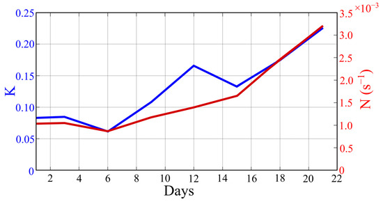 Dimensionless parameter of the vortex core vertical oblateness K (blue curve) and the Väisälä–Brunt frequency N (red curve). The abscissa axis shows the days of the vortex lifecycle from the beginning of measurements on 3–24 April 2012.