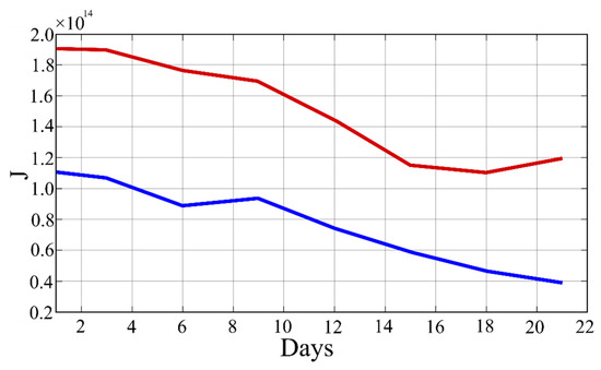 Kinetic (blue curve) and available potential (red curve) energy of the vortex (J). The x-axis shows the days of the vortex lifecycle from the beginning of measurements on 3–24 April 2012.