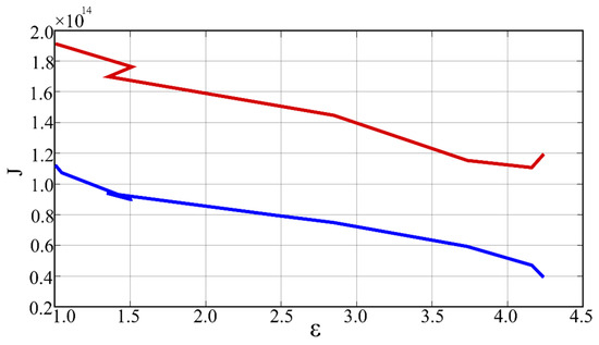 Dependence of kinetic (blue curve) and potential (red curve) energy on the dimensionless parameter of horizontal elongation ε inferred from the in situ data.