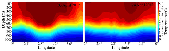 The change in the available potential and kinetic energy of the vortex associated with its horizontal elongation (the ε parameter) is analyzed next. Analysis (Figure 5) shows a linear decrease in energy with an increase in the elongation parameter. According to Figure 4 and Figure 5, the total energy of the vortex when it is stretched decreases by about 2.3 times. The vortex core transformation during its elongation is also confirmed by the changes in the thermohaline characteristics of the vortex. Figure 6 shows the temperature longitudinal cross-sections of the vortex. When the vortex is stretched, the part of the core limited to the 5° C isotherm is compressed several times. The vortex still had a round shape at the start (3 April 2012), when the 5 °C isotherm is located at 600 m depth, but retreated to ~300 m depth by 21 April. In other terms, the area is reduced in depth by half during the lifetime of the vortex. On the contrary, the part of the core bounded by the 4.5 °C isotherm stretches along the vortex in the longitudinal direction. Note that in Figure 6, the vortex is not an ellipsoid but rather a semi-ellipsoid. However, there is no contradiction in this since the theory of ellipsoidal vortices can be also applied to cases of subsurface vortices when a semi-ellipsoid is considered as a vortex [43]. Similar changes in salinity and potential density isolines are also found during the analysis.