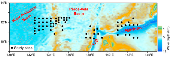 As can be seen in Figure 3 and Figure 4, the Eh values are relatively high in the West Philippine Basin and the Parece Vela Basin and low at the sites from the Yap and Mariana trenches. The spatial pattern of the Eh values can be attributed to the generally deeper water depths of the study sites in the two basins, where the dissolved oxygen levels are maintained by the Antarctic bottom water (AABW) [34,35] and/or the unique submarine topography [36,37].