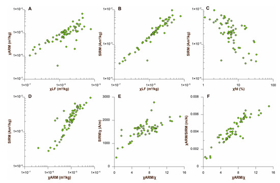 Scatterplot of the relationships between selected magnetic parameters (A–F). It is noted that there were in total 66 samples analyzed.
