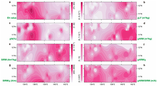 Spatial distribution of Eh values and the selected magnetic parameters (a–h).