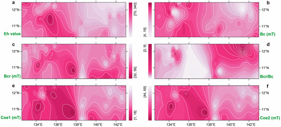 Spatial distribution of Eh value, Bcr/Bc, and magnetic coercivities (a–f). Note that the scales in (c,e,f) are reversed.
