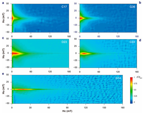 FORC diagram for five representative samples. All diagrams were produced using the FORCme software with a smoothing factor of 3. Sample G14 (e) was subjected to high-resolution FORC analysis (360 lines), while for the other samples (a–d), a standard analysis was conducted (90 lines).
