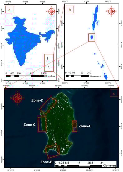 Study area map displaying (a) the India region, (b) the Andaman and Nicobar Islands, and (c) the selection of zones (A, B, C, and D) for assessing the immediate impact and periodical impact of the tsunami on South Andaman’s coastal shoreline.