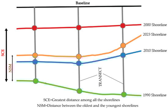This study employed end point rate (EPR) and net shoreline movement (NSM) statistical methods for immediate and periodic shoreline change analysis. The methods EPR, NSM, and SCE (shoreline change envelope) were selected for use in the shoreline erosion studies due to their distinct advantages and applicability in analyzing different aspects of shoreline change. EPR provides a straightforward measure of the overall erosion or accretion rate, NSM allows for the assessment of net shoreline movement over time, considering both erosional and accretional changes, and SCE enables a more detailed examination of localized variations in erosion or accretion rates along the shoreline. Net shoreline movement (NSM) represents the distance between each transects oldest and most recent shorelines, with units in meters. Shoreline change envelope (SCE) measures the distance (in meters) rather than the rate. The SCE value signifies the most significant distance among all shorelines intersecting a given transect, as illustrated in Figure 2. Since the total distance between two shorelines has no sign, the SCE value is always positive.