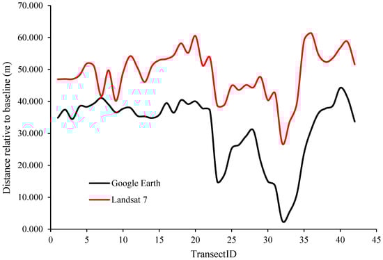 The RMSE method was chosen to be used for the purpose of validating the coastal shoreline of South Andaman. When validating Landsat-7 and Google Earth’s ability to detect coastal shorelines, the root mean square error (RMSE) was used as a criterion to evaluate the two platforms’ performance. The RMSE was determined through the use of Equation (3). As can be seen in Figure 3, a calculation was performed to determine the distance that separates each transect from the baseline to the riverbank line, which can be seen in Google Earth and satellite images.