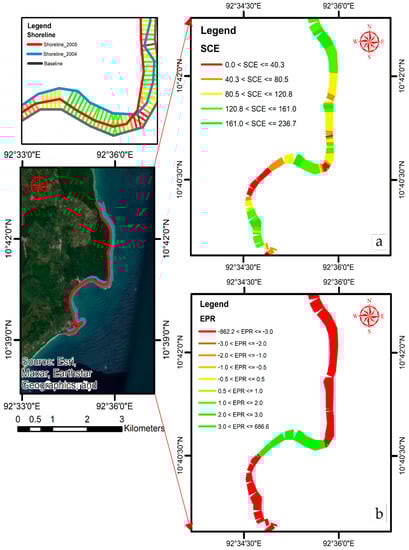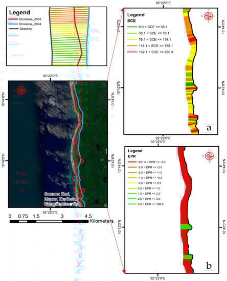 Immediate coastal shoreline changes (2004–2005) of zone B, South Andaman: (a) shoreline change envelop (SCE) showing the migration of the 2005 coastal line from the 2004 coastal line, and (b) end point rate showing erosion and accretion of the coastal shoreline between 2004 and 2005.
