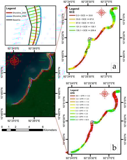 Immediate coastal line changes (2004–2005) of zone A of South Andaman: (a) shoreline change envelop (SCE) showing the migration of the 2005 coastal line from the 2004 coastal line, and (b) end point rate (EPR) showing erosion and accretion of the coastal shoreline between 2004 and 2005.