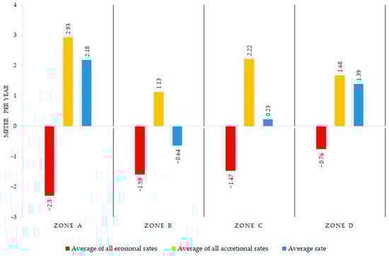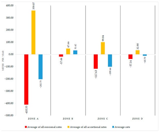 The maximum average erosion rate observed between 2004 and 2005 after the tsunami in zone A was −410.55 m/year, and the maximum accretion rate was also observed in zone A, which recorded 359.07 m/year, as shown in Figure 8. Zones A and C were the most affected parts, as demonstrated by this tsunami’s very high erosion and accretion rates compared to zones B and D. Zone B was the least affected zone, with the lowest erosion and accretion rates.