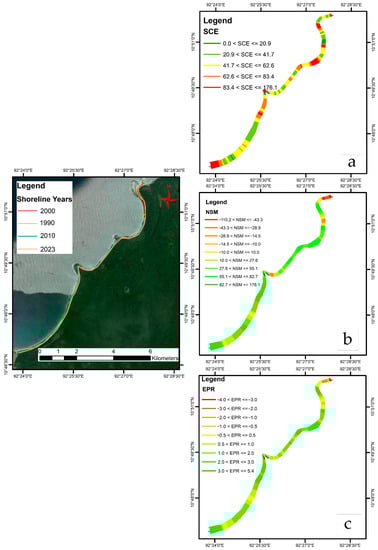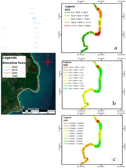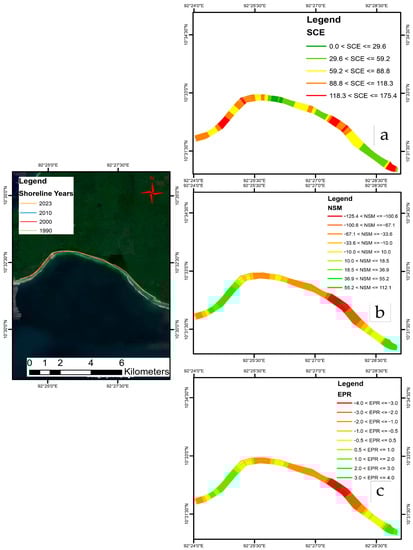 Periodical changes (1990–2023) of zone C, South Andaman: (a) showing the most significant distance between the shoreline, (b) distance between the oldest (1990) and most recent shorelines (2023), and (c) end point rate, showing erosion and accretion of the coastal shoreline between 1990 and 2023.