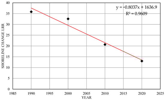 Cross-plot illustrating shoreline change through the linear regression rate (LRR), showcasing the relationship between shoreline positions and time.