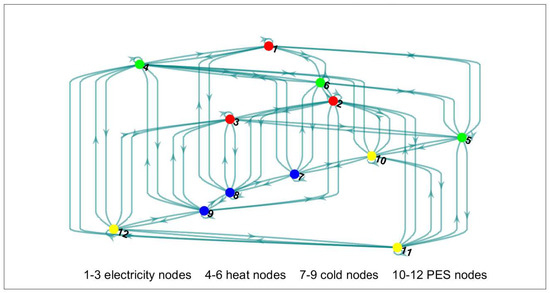 As mentioned above, we constructed a communication network consisting of 12 nodes, including 3 electricity nodes, 3 heat nodes, 3 cold nodes and 3 PES nodes. Note that the described conditions required the adjacency matrix of the 12 nodes to be updated once every two iterations: we chose one of the figures which satisfied the conditions, as shown in Figure 3.