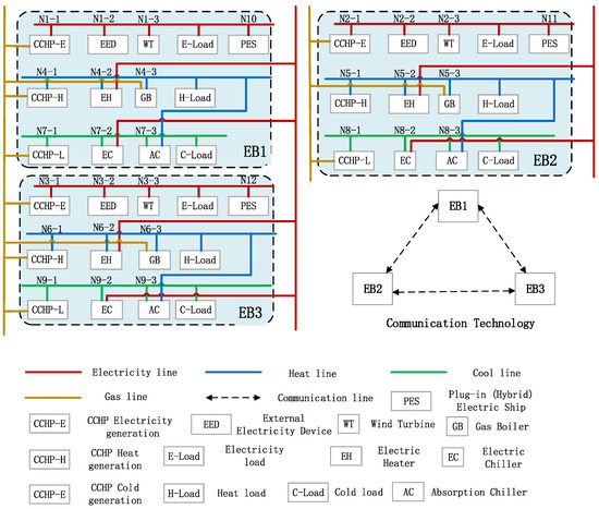 For this section, a PIES was established, based on a polymorphic network, to incorporate various heterogeneous devices, depicted in Figure 2. The PIES comprised N Energy Bodies (EBs), consisting of various devices, including CCHP, EH, EC, Wind Turbine (WT), GB, AC, and PES. The CCHP device served as the energy conversion center, providing cold, heat, and electricity to the seaport. The EH and EC devices were crucial for promoting a sustainable and environmentally friendly energy structure, because they served as the electricity replacement devices. To implement intelligent control of different nodes, a polymorphic network was applied, to support communication between the heterogeneous devices.