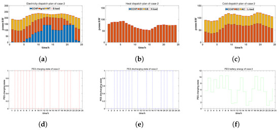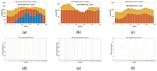 Dispatch plan of Case 3: (a) electricity dispatch plan; (b) heat dispatch plan; (c) cold dispatch plan; (d) PES charging state; (e) PES discharging state; (f) PES battery energy.