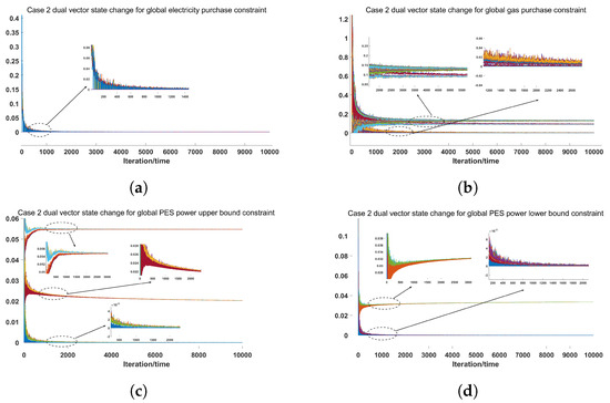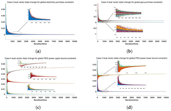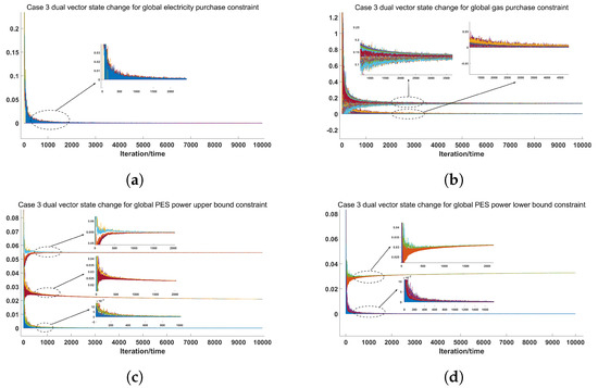 It can be seen from Figure 10 that all the vectors of the dual variables converged to a consensus value at the end of the optimization process. As shown in Table 5, the total cost of Case 3 was CNY 12,213.4, and the costs for electricity, heat, cold, and the PES were CNY 8468.6, 2811.1, 951.3, and −17.68, respectively.