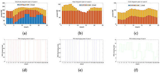 Dispatch plan of Case 4: (a) electricity dispatch plan; (b) heat dispatch plan; (c) cold dispatch plan; (d) PES charging state; (e) PES discharging state; (f) PES battery energy.