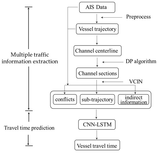 An AIS (Automatic Identification System) is a system that actively transmits data from vessels regarding vessel movement information, such as longitude, latitude, speed, vessel type, time, maritime mobile service identity (MMSI), etc., through a transmitter. Hence, an AIS records useful information relative to travel time along the vessel’s itinerary, such as motion trajectory, regional vessel density, average speed, and the direct travel time from a fixed origin to the destination over time, making it beneficial for the prediction of vessel travel time.