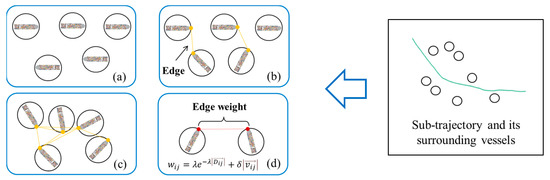 The deduction of whether there is an interaction between a pair of vessels is determined by calculating their convergence and divergence relationships, which are represented by the approaching rate in (2). If the approaching rate is greater than or equal to 0, the vessel pair exhibits a divergence trend and does not have any interactions, as shown in Figure 3a. Otherwise, there is a convergence trend, indicating the possibility of congestion, as shown in Figure 3b,c; subsequently, the weight of each edge is calculated using Equation (3). The closer the relative distance and the greater the relative speed between vessels, the higher the risk of congestion or collision; therefore, we use the relative distance inverse function and relative speed to quantitatively express the weight in Equation (3)