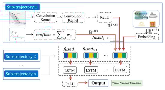 (2) We propose a vessel travel time prediction model based on three feature fusion modules: traffic context features, trajectory features, and environmental features. Spatial and temporal correlations are captured through convolutional processes and LSTM neural networks. The proposed model provides the opportunity to personalize vessel travel time recommendations based on a vessel’s power characteristics.