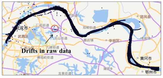 The AIS data used in this paper were collected from the database of the Ship Supervision Center of the Wuhan Maritime Safety Administration, corresponding to a dataset covering an area of approximately 141 km in the Wuhan section of the Yangtze River and spanning 1 October to 1 December 2022, as shown in Figure 7. However, the AIS data as a series of messages following a nonstandard pattern of irregular time intervals and there are many bad datapoints due to transmitter failures, which often leads to inaccuracies or drift. Therefore, a preprocessing step was needed to clean the data and remove errors, which includes two aspects.