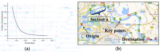 (a) Relationship between distance threshold of DP algorithm and number of retained key points in the channel’s centerline. (b) Visualization of key points.
