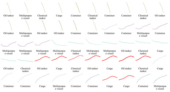 The entire trajectories were segmented according to the key points, and we displayed part of vessel sub-trajectories, where each sub-trajectory is labeled with its vessel type, as shown in Figure 11. Inspired by previous work [7], the sub-trajectories were then projected onto two-dimensional pictures. A CNN was then applied to extract the spatial structure relationships between the vectors, where the extracted information was combined with traffic interaction information to predict vessel travel time.