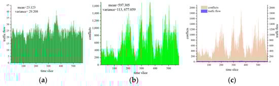 Traffic context information of the Wuhan section from 9:00 on 11 December 2022 to 9:00 on 13 December 2022: (a) Traffic flow changes; (b) traffic interaction status changes represented by conflicts; (c) Comparison of the traffic flow and conflicts.