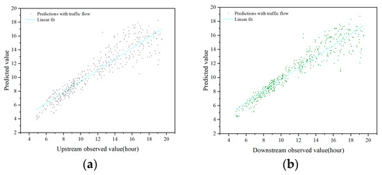 Error comparison of different traffic contexts. The x-axis represents observed travel time, and the y-axis represents predicted value. (a) Comparison with traffic flow in Upstream set; (b) Comparison with traffic flow in Downstream set; (c) Comparison with VCIN in Upstream set; (d) Comparison with VCIN in Downstream set.