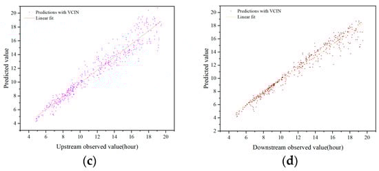 Comparing Figure 14a,b with Figure 14c,d, it can be observed that our model leveraging the VCIN’s analysis significantly improves prediction performance in both upstream and downstream prediction tasks. While the traffic flow captures only static features and does not fully reflect the dynamic interactions of vessels impacting the vessel speed and travel time, the metric successfully captures this detail and provides evolving information through its fluctuating value, leading to improved prediction accuracy. Specifically, a higher value may indicate a longer travel time.