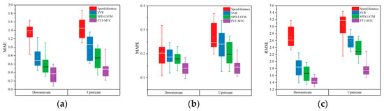 Comparison of MAE, MAPE, and RMSE. (a) MAE comparison; (b) MAPE comparison; (c) RMSE comparison.