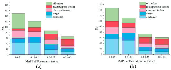 Error distribution of different types of vessels. (a) MAPE distribution in Upstream; (b) MAPE distribution in Downstream.