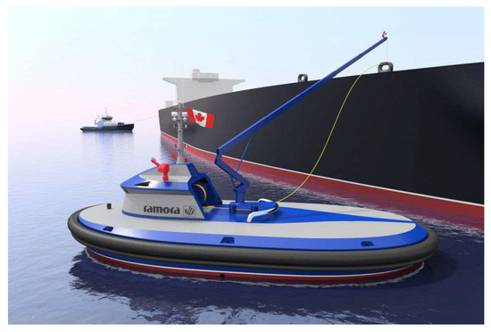 In 2015, Robert Allan of the United States presented a conceptual model of an autonomous tugboat that involves the installation of a towline between the mothership and the tugboat, as shown in Figure 6 [16]. Subsequently, there has been an ongoing effort to develop the world’s first remotely controlled unmanned commercial tugboat that can operate over a wide range in collaboration with the Abu Dhabi Port Authority (ADP) of the United Arab Emirates (UAE) [17]. The development of such an autonomous tugboat is expected to provide significant benefits, such as improved safety, efficiency, and cost-effectiveness of towing operations in the region.