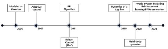 Figure 9 shows the timeline of notable studies, and Table 3 contains brief descriptions of these studies. In an early study in the early 2000s, tugboats were modeled as azimuth propellers installed in motherships, and it was assumed that the tugboats only exerted pushing forces [18]. Following this work, adaptive control techniques were applied in subsequent studies [19,21,23] to compensate for uncertainty in the contact point between the tugboat and the vessel, as well as the hydrodynamic parameter values. Bui [2] minimized the power consumption of the tugboat and improved controllability by utilizing the redistributed pseudoinverse (RPI) algorithm to determine the thrust and direction of each tugboat. In a later study [24], the sliding mode control technique, a robust control approach, was applied to environments with disturbances, such as wind, current, and waves. It is important to note that the studies discussed in this paragraph modeled the tugboats as thrusters. Therefore, it cannot be considered swarm control. Moreover, these studies did not consider the towing operation of tugboats using towlines.