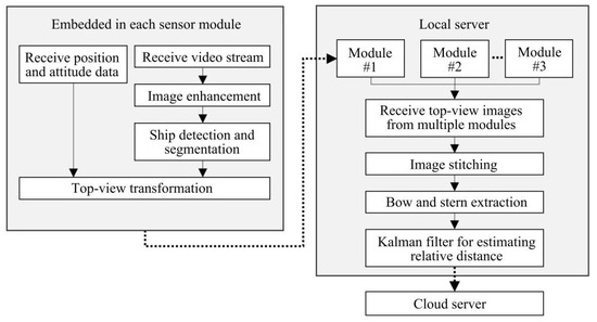 In addition, in terms of perception technology, research using AI technology has been actively conducted recently. When AI technology is applied, it can have advantages in terms of cost and performance compared with existing sensors, and it has the advantage of further enhancing situational awareness in terms of sensor fusion. The information below introduces perception technologies applied with artificial intelligence in studies within the last three years. Ref. [41] proposed a new artificial intelligence vision-based monitoring system for berthing ships (AVMS), as shown in Figure 10. Accurately estimating the relative distance between the wharf wall and the ship is necessary to anchor a ship, but the widely used berthing assistance system (BAS) is expensive and has limitations depending on the size of the ship. An AVMS sensor module is composed of a low-cost camera, DGPS (Differential Global Positioning System) receiver, and inertial measurement unit (IMU), and its performance was compared with the existing BAS. AVMS showed strong performance in poor weather conditions compared with the existing laser distance sensor-based BAS, and it can be applied directly in the actual port by providing real-time image information of ships approaching the quay wall.