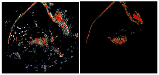 In [43], a new concept called ISAS (Intelligent Situational Awareness System) was introduced to detect maritime objects by fusing information from multiple sensors and tracking object motion. A deep learning algorithm was utilized to detect objects, while PDA ((Probabilistic data association) and JPDA (Joint Probabilistic Data Association) were used to associate data in the tracking process. The ISAS environmental awareness sensor is composed of a camera, LiDAR, and radar. In order to improve situational awareness, the Mask R-CNN (Region-based Convolutional Neural Network) algorithm, an instance segmentation method, was applied to detect overlapping objects on the sea when using camera-based objects. Moreover, a lightweight module-based image noise reduction model was designed and trained using radar images captured in the ocean environment to eliminate noise during radar-based object detection. Figure 11 illustrates the noise reduction outcome for the radar image. The study conducted sensor fusion of camera and radar data.