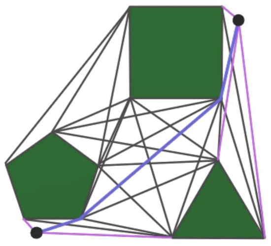 Lastly, in studies related to ship berthing using autonomous tugboat swarms, control problems have been addressed by controlling the swarm of tugboats to follow the desired (reference) trajectory of the mothership. However, in complex and difficult berthing scenarios, path planning problems must be addressed, taking into account the spatial constraints of the swarm with respect to the shape of port. The A star search algorithm, which is a commonly applied method, is an optimal path generation algorithm that uses a road map called a “visibility graph” to create an optimal path even in a complex environment. When applied to a swarm of tugboats, it finds the optimal route, but the route is not smooth, causing sudden movements of the tugboats, which can make them difficult to control [33]. Figure 13 illustrates the concept of the visibility graph. In research [33], the autonomous swarm control of unmanned ships was verified through the development and study of path planning algorithms. The A star search algorithm was adjusted for unmanned ships, and an algorithm was developed to explore the path of unmanned ships using information about their dimensions, position, and direction. In addition, the shortest path of all points was calculated offline, improving the speed of the A star search algorithm by 12.3 times. In this study, the path planning system was verified using the Robot Operating System framework.