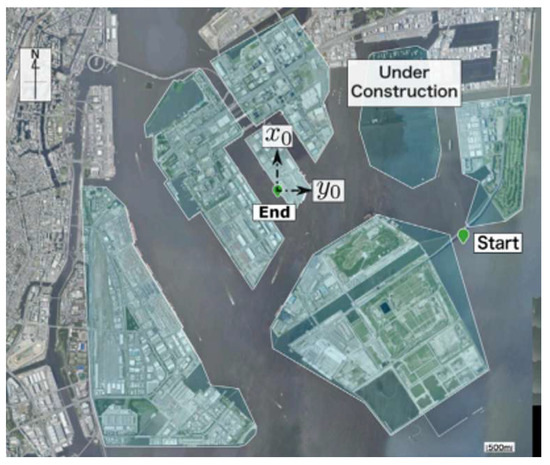 In the work by [35], a path planning problem that considers obstacles in two actual harbor environments is presented (as in Figure 14), in contrast to previous studies that performed path following control of the mothership according to the planned path after setting the departure and destination points. To optimize path planning in actual ports, obstacles such as berths, breakwaters, and buoys are represented as polygonal obstacles, and a collision avoidance algorithm is applied based on the ship domain that changes depending on the ship’s speed to maintain a sufficient distance from the obstacles. At the same time, an optimization method for path planning, including the effect of wind disturbance and waypoints, is presented. The paper dealt with the optimization problem of path planning that takes into account the complex actual harbor environment of obstacles, external disturbances, and other factors in the berthing situation of a single ship. In addition, if the technique of tracking and controlling the path of the mothership using several tugboats is applied, the path planning optimization problem of the mothership cluster can be solved.