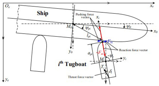 In order to better reflect the actual operation method, Tran et al. [53] developed a ship berthing system that utilizes cooperative control between the damper and tugboat, as well as a subsequent study [54] was conducted to design a berthing system considering the ship characteristics and dynamics of the towline. However, the dynamics of the entire system were not taken into account. In actual tugboats, controlling the mothership accurately to the predefined path using a towline is challenging. If the tugboat and the vessel to be towed follow different paths due to waves and complex maneuvering environments, the risk of collision is high, making precise control of the path essential. To address this challenge, Quan [27] proposed a basic mathematical model of a tugboat equipped with three active rudders (see Figure 16). As tugboats are dependent on the towline to pull the vessel or deal with obstacles, Quan proposed a follow-up control for the leader to enhance the tracking performance of the towed vessel along the path of the tugboat.