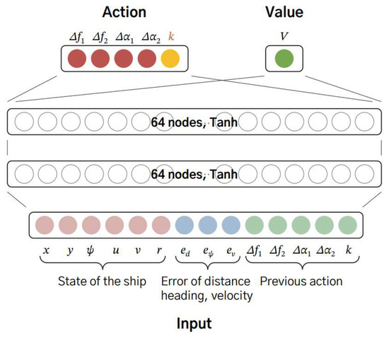 The study in [29] proposes a hybrid control concept that combines a discrete-time dynamic model accounting for the tugboat’s position movement and a continuous-time dynamic model representing the tugboat control. A control approach using the policy gradient-based Proximal Policy Optimization (PPO) algorithm is introduced, which is suitable for continuous action spaces and has shown high performance in reinforcement learning. The PPO algorithm is an artificial intelligence technique used to determine the optimal action to take in the current state. In the study in [29], the error between the current state and the state of the target ship is calculated, and the compensation value is obtained to minimize the error, maximizing the outcome. In Figure 21, the output value of the network consists of a total of five values() that select the amount of change in the force of each tugboat, the amount of change in the direction of the force, and the tugboat mode. Among these, the k value was discretized into two continuous action values from −1 to 1 to represent the discretized mode change in the tugboat. If −1 to 0, q1 (towing mode), and if 0 to 1, q2 (berthing mode), were used to select the tugboat mode. Network inputs are and r, representing the state of the ship and and (distance error, heading error, and velocity error), and the output value of the previous step was set as the network input value in the current step.