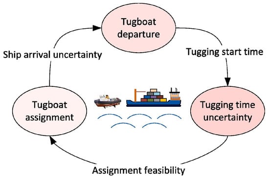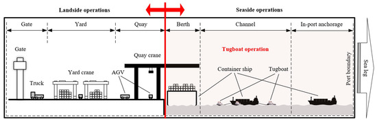 The shipping industry faces many interrelated challenges and opportunities as its role in the global trading system has become increasingly important over the past few decades. On the one hand, a collaboration between port terminals and shipping lines can reduce costs and achieve sustainable supply chains, and on the other hand, optimizing operations and voyage times can reduce bunker consumption and lower fuel costs and air emissions. Therefore, there is a growing need to address the consolidation opportunities and environmental challenges associated with container shipping through optimization. Container port operations can be classified into two categories: landside operations and seaside operations. The landside usually consists of a gate, yard, and quay, while the seaside consists of berth and channel anchorage areas. As shown in Figure 22, container ships require the assistance of tugboats. However, the availability of tugboats and the ability of each tug to serve a ship is limited. Therefore, for tugs to provide effective service to large ships, they must be effectively utilized.