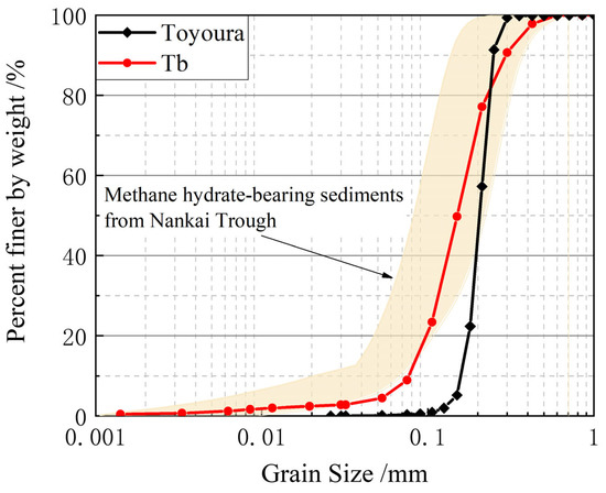 Temperature-controlled and high-pressure plane strain shear test instruments with an observation window have been used to study the influence of hydrate and fine particles on the strain rate dependence of hydrate-bearing sediments. The schematic diagram of the instrument is shown in Figure 1. The size of the specimen is 60 mm (length) × 80 mm (width) × 160 mm (height). The pore and confining pressure of the specimen are controlled by different syringe pumps with an accuracy of ±0.1 MPa. The maximum axial loading force that the instrument can provide is 200 kN, with a measurement accuracy of 0.2 kN. A latex film with a grid (the minimum unit is 2.5 mm × 2.5 mm) attached to one side of the specimen can be used to measure the local deformation of the specimen. The picture of the specimen during the shearing process can be recorded by the electronic camera through the window on the instrument. More detailed information on these instruments can also be found in our previous reports [34]. Toyoura and the sand named Tb were used as the host sand in this study due to their similar particle size distributions to those found in the Nankai Trough NGH reservoirs [11]. The size distribution of these samples is shown in Figure 2, and Tb has a higher content of fine particles than Toyoura.