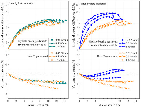 The left portion of Figure 3 presents the stress–strain relationship of the host Toyoura sand and the hydrate-bearing sediments with a low hydrate saturation under different strain rates. Under the same strain rate, the existence of a small amount of hydrate can slightly increase the peak strength, initial stiffness, and residual strength of the hydrate-bearing sediments. With respect to volumetric strain (where positive values indicate compression), all samples exhibit similar volumetric compressive behaviors, except for the host Toyoura sand, which displays a more pronounced volumetric compressive behavior at a strain rate of 0.05%/min. The strain rate shows slight effect on the stress–strain curves of the host Toyoura sand and the hydrate-bearing sediments with a low hydrate saturation. The right portion of Figure 3 shows the stress–strain relationship of the host Toyoura sand and the hydrate-bearing sediments with a high hydrate saturation. In this case, the peak strength, initial stiffness, and residual strength of the hydrate-bearing sediments increase significantly due to the existence of hydrate, and the stress–strain behavior of hydrate-bearing sediments is also greatly affected by the strain rate. At a high strain rate (1%/min), the peak strength and initial stiffness of the hydrate-bearing sediment are significantly increased. With regard to volumetric strain, there is an increase in both hydrate saturation and strain rate facilitated volumetric expansion behavior in the hydrate-bearing sediments.